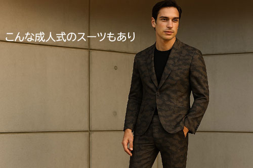 定番を超えた大胆な迷彩柄スーツ、紺とえんじの2色をご用意しました。