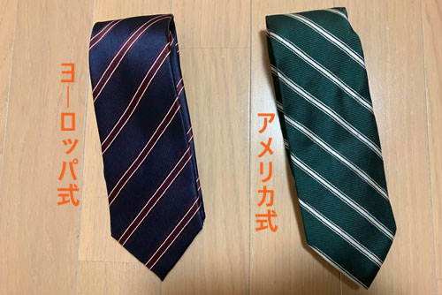 それをアメリカに持ち込んで、反転させたのがブルックスブラザーズです。ですから左上がりはアメリカ式です。(下-右の写真)