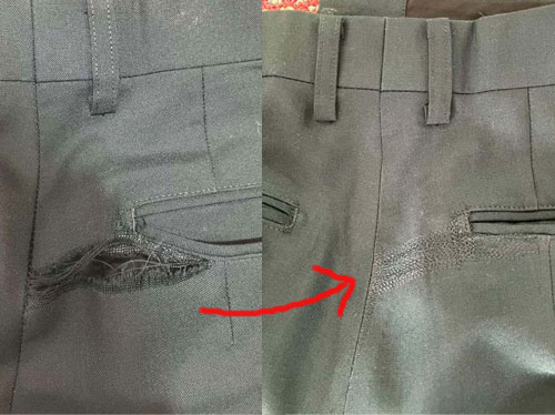 写真のズボンをかけはぎ修理したら〇万円と高額な修理金額になるでしょう。